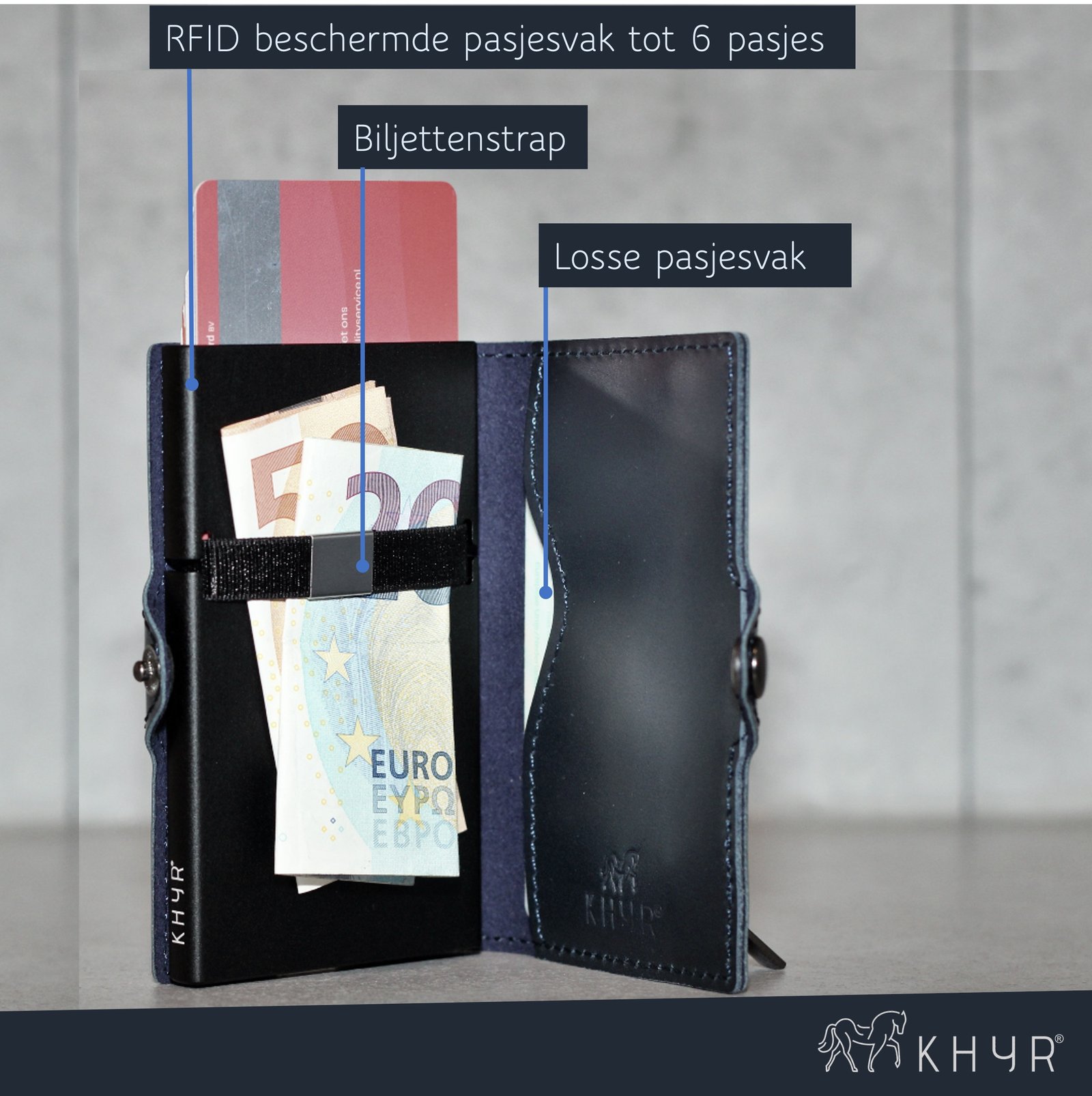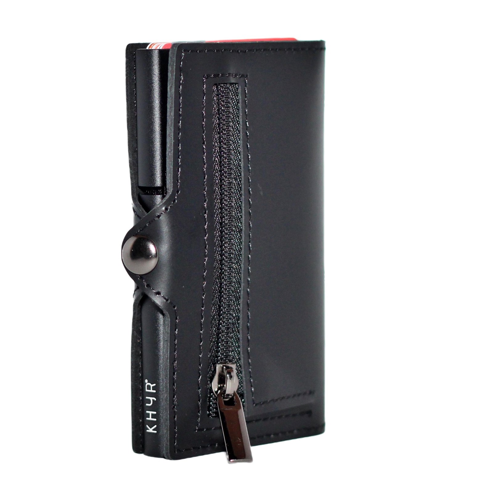 De KHYR® Aconcagua pasjeshouder biedt ruimte aan 7 pasjes en achter de handige elastiek clip kun je ook bankbiljetten kwijt. De ritsvak biedt ruimte voor muntjes. Dankzij het innovatieve uitschuifmechanisme heb je met één simpele schuifbeweging snel toegang tot al je kaarten.
