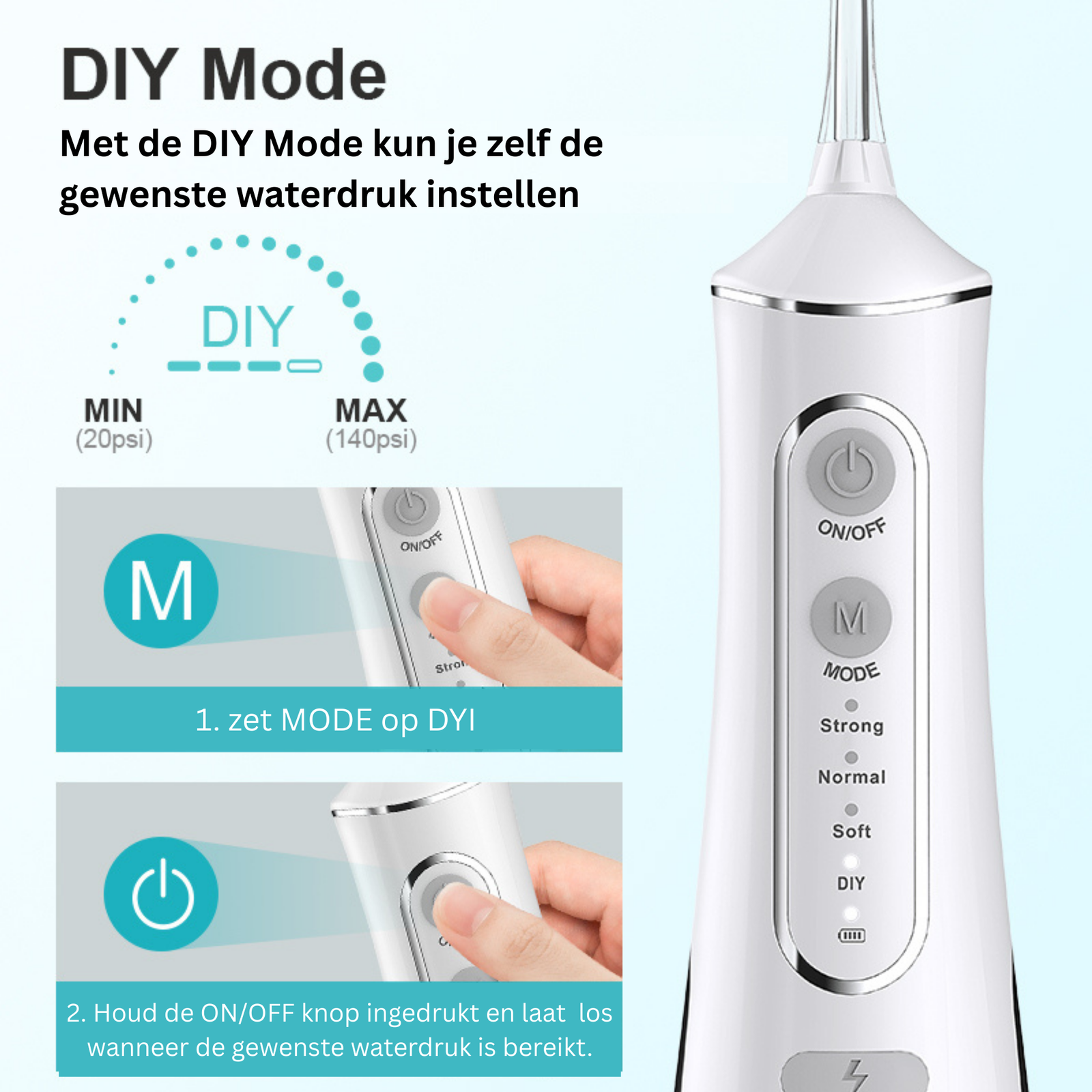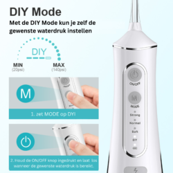 DIY mode: de JetFloss i2 beschikt over een de DIY mode. Hiermee kun je zelf de sterkte van de floss waterstraal instellen. Zet de mode op DIY en houd de AAN/UIT knop ingedrukt. Hiermee neemt de kracht langzaam toe van 20psi tot max 140psi. Laat bij de gewenste waterdruk de AAN/UIT knop los.