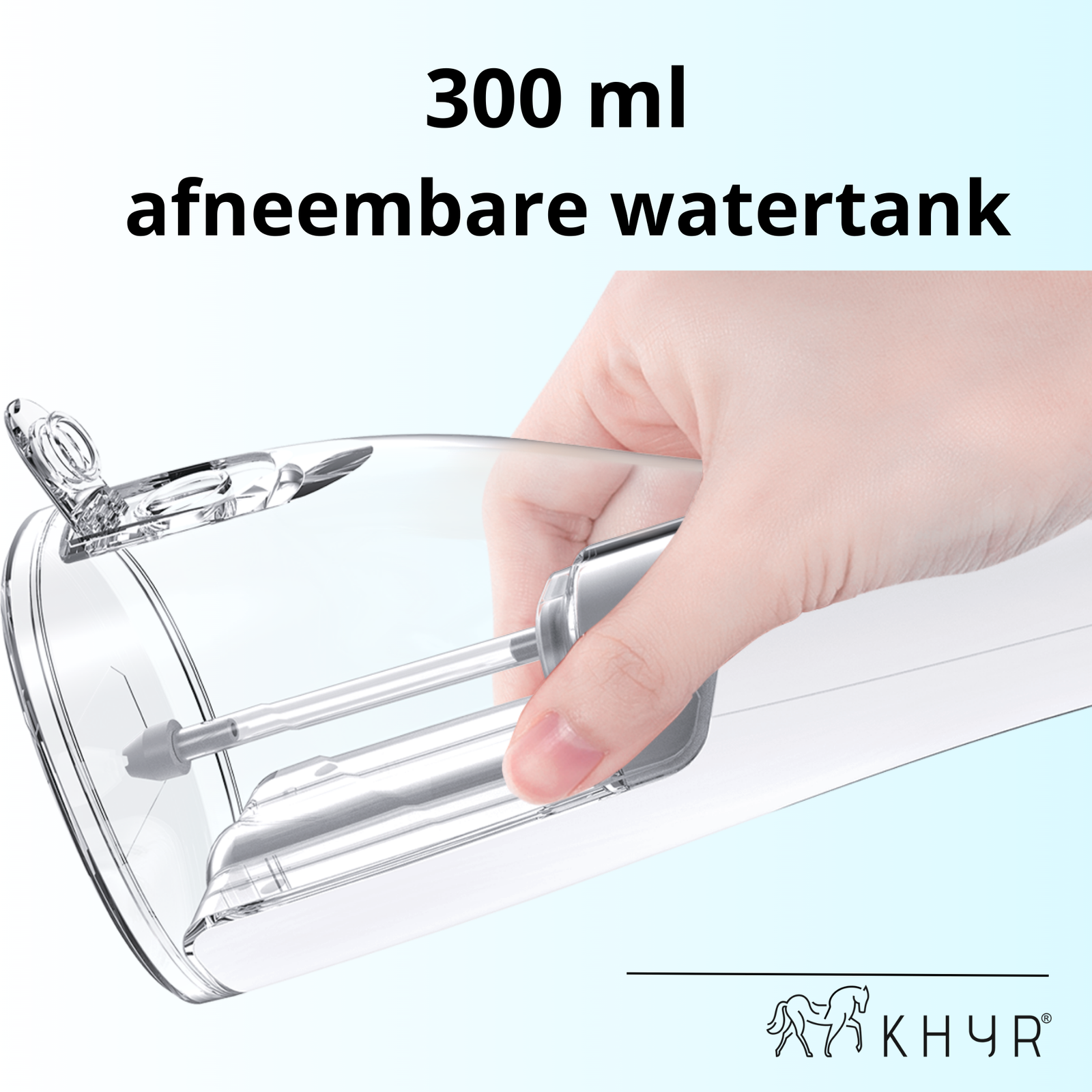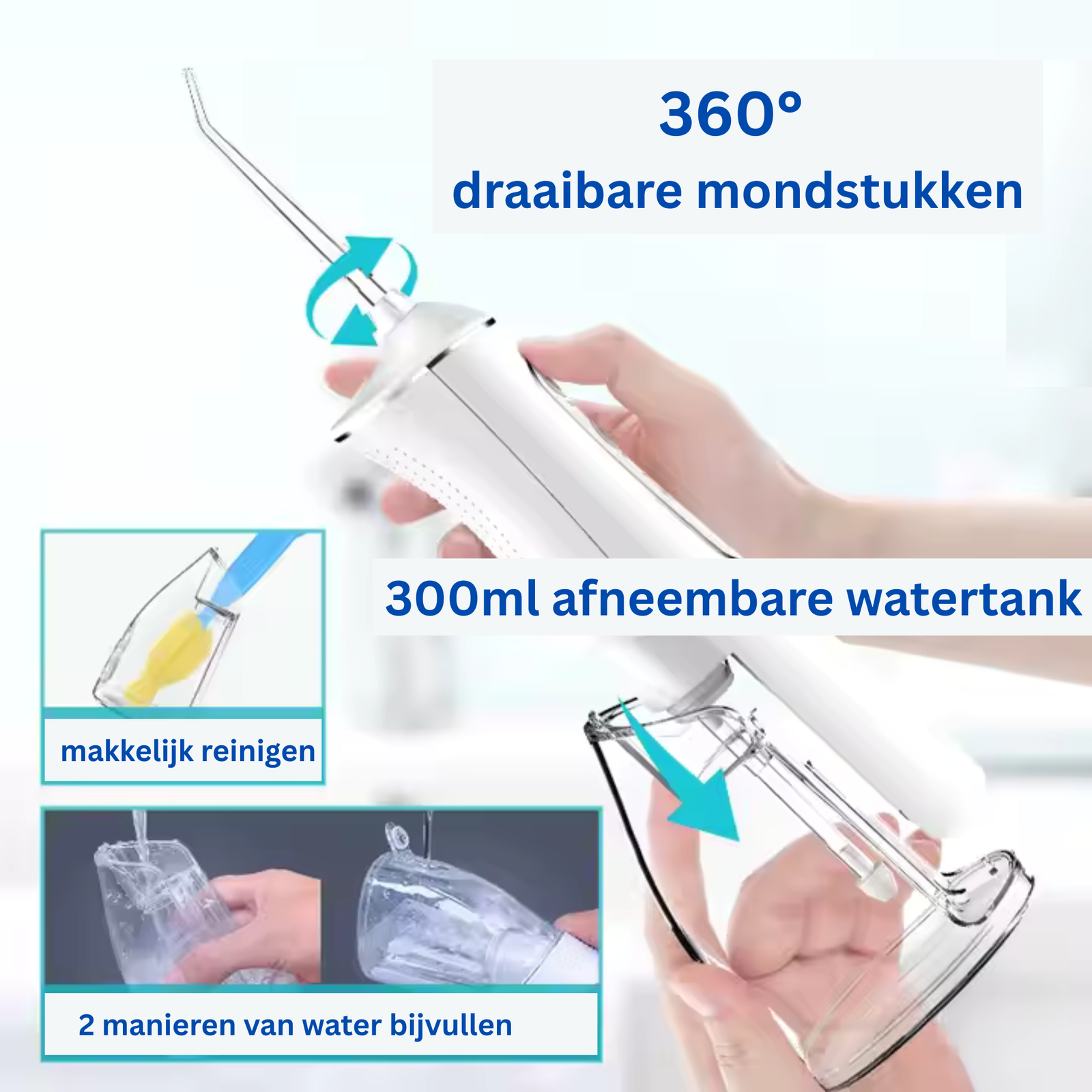 - Groot waterreservoir van 300ml – Goed voor een volledige poetsbeurt. Vul de tank eenvoudig bij via de bijvul klep voor een volgende flosbeurt.
