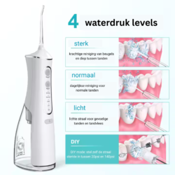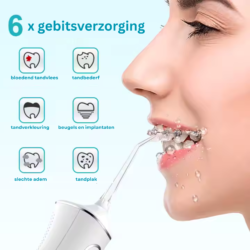 - Krachtige Waterdruk (1600 pulsen/min) – Verwijdert effectief tandplak en voedselresten, zelfs op lastige plekken tussen tanden en kiezen.
