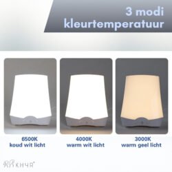 1. Kleurtemperatuur: in 3 standen, 3000K – 6500K lichtkleur (warm wit tot koel daglicht).